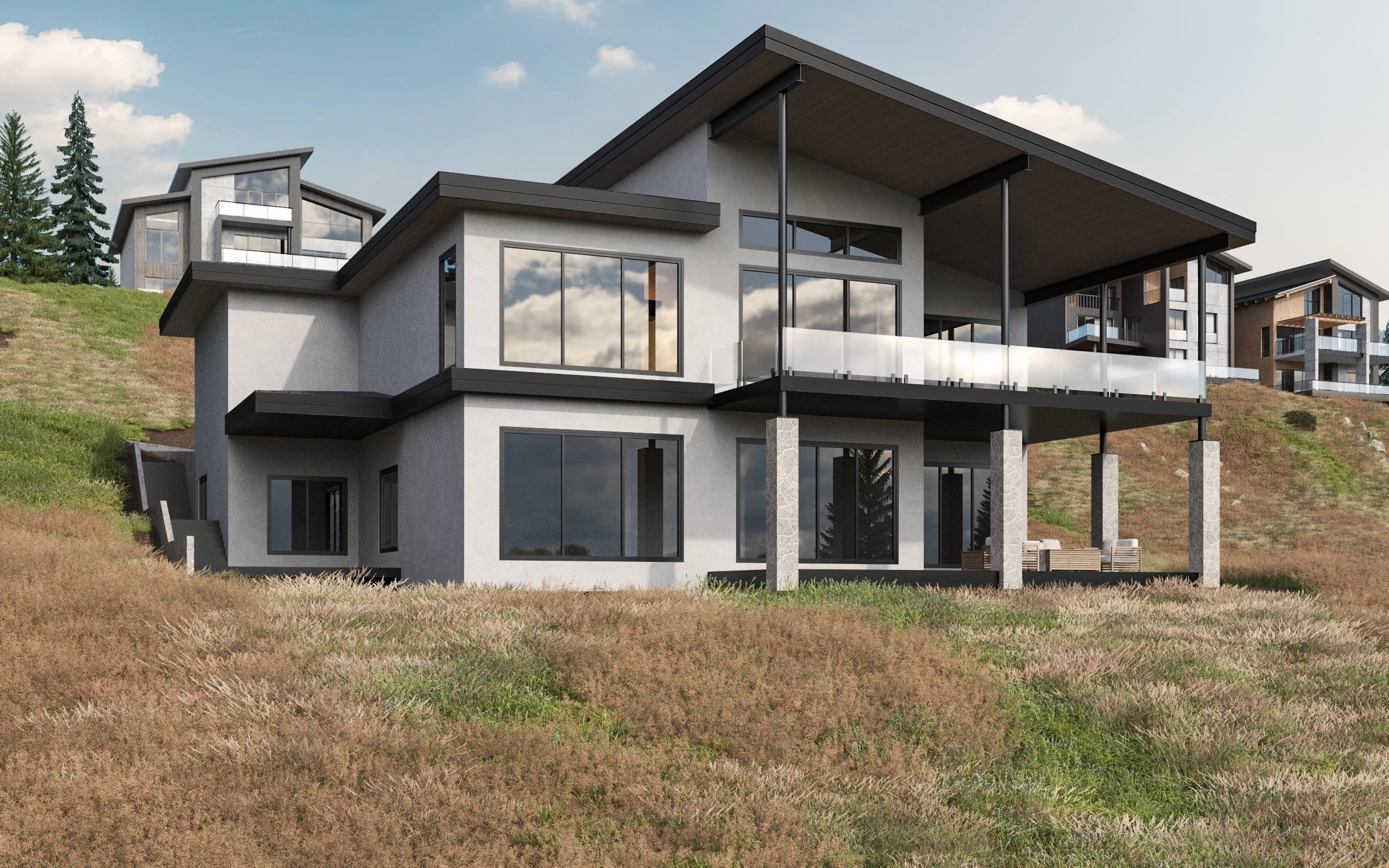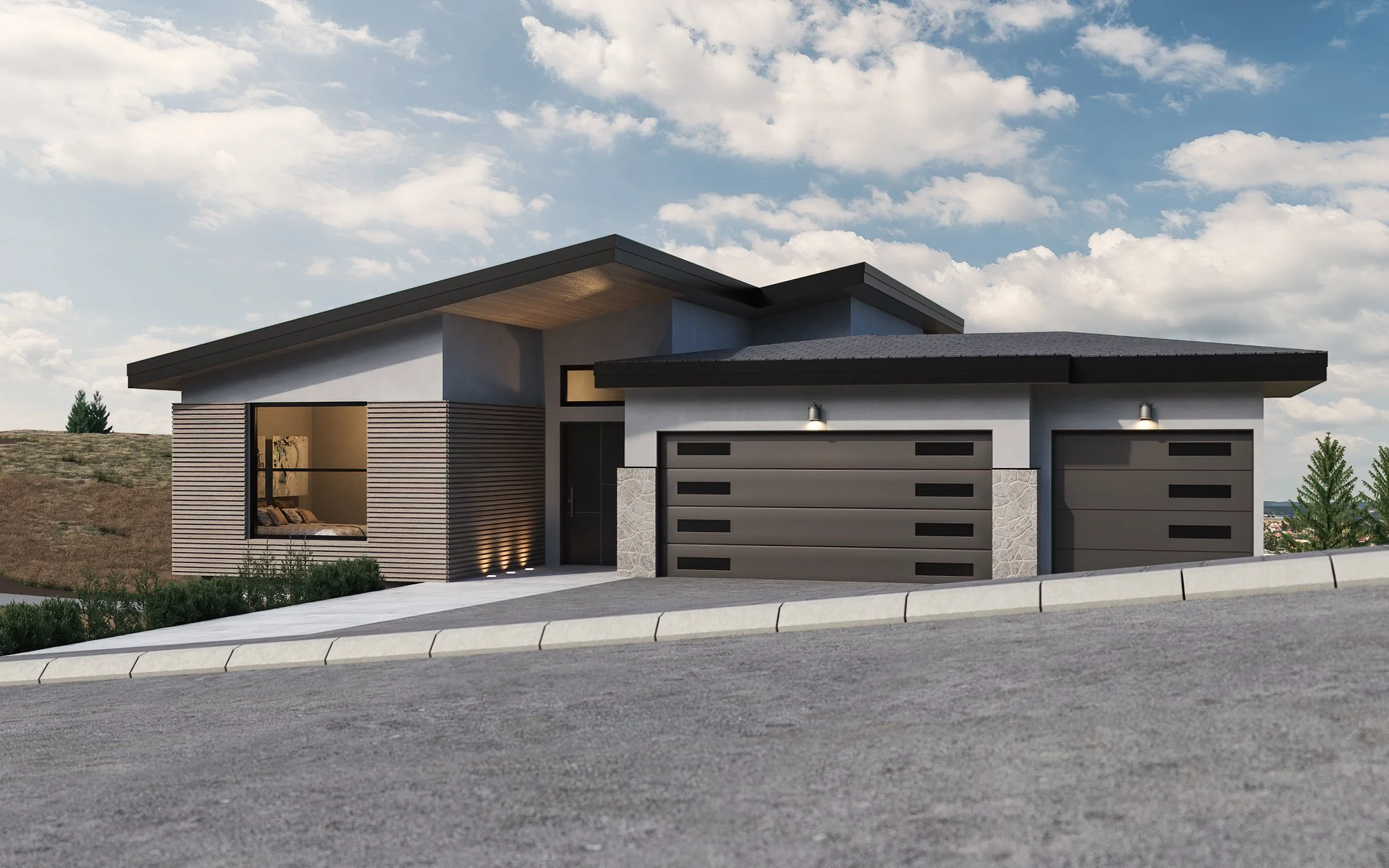 This Okanagan Modern home on a view-lot in Upper Mission Kettle Valley can be customized to your specification. It features 4,622 square feet on two levels. The main floor contains a master bedroom with a walk-in closet and a luxurious ensuite and second bedroom. The bottom level features a large activity room, games room, bathroom, 2 more bedrooms, and a large storage area. The games room and storage area can be built for a 2-bedroom live-in suite and a one-bedroom Air B&B Suite with kitchenette.
